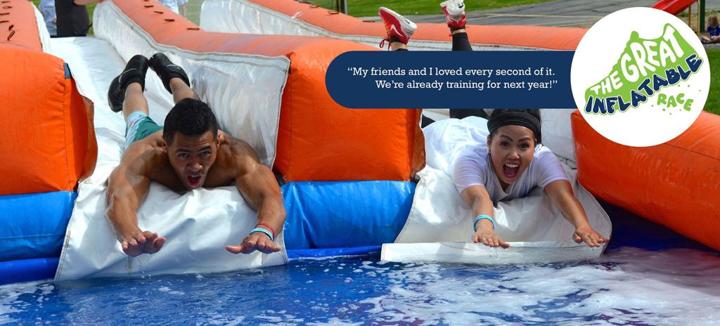 Heats start at 9 am and go every half an hour until everyone has had a chance to run. We recommend arriving 30-60 minutes before your scheduled heat. You’ll be running through giant inflatable obstacles and inflatable slides spread throughout the 5K course, so be prepared for lots of fun!